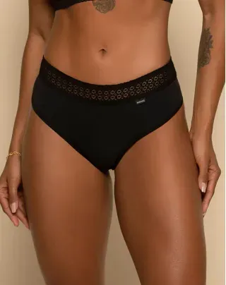 Calcinha modelo fio dental em microfibra e cintura rendada;